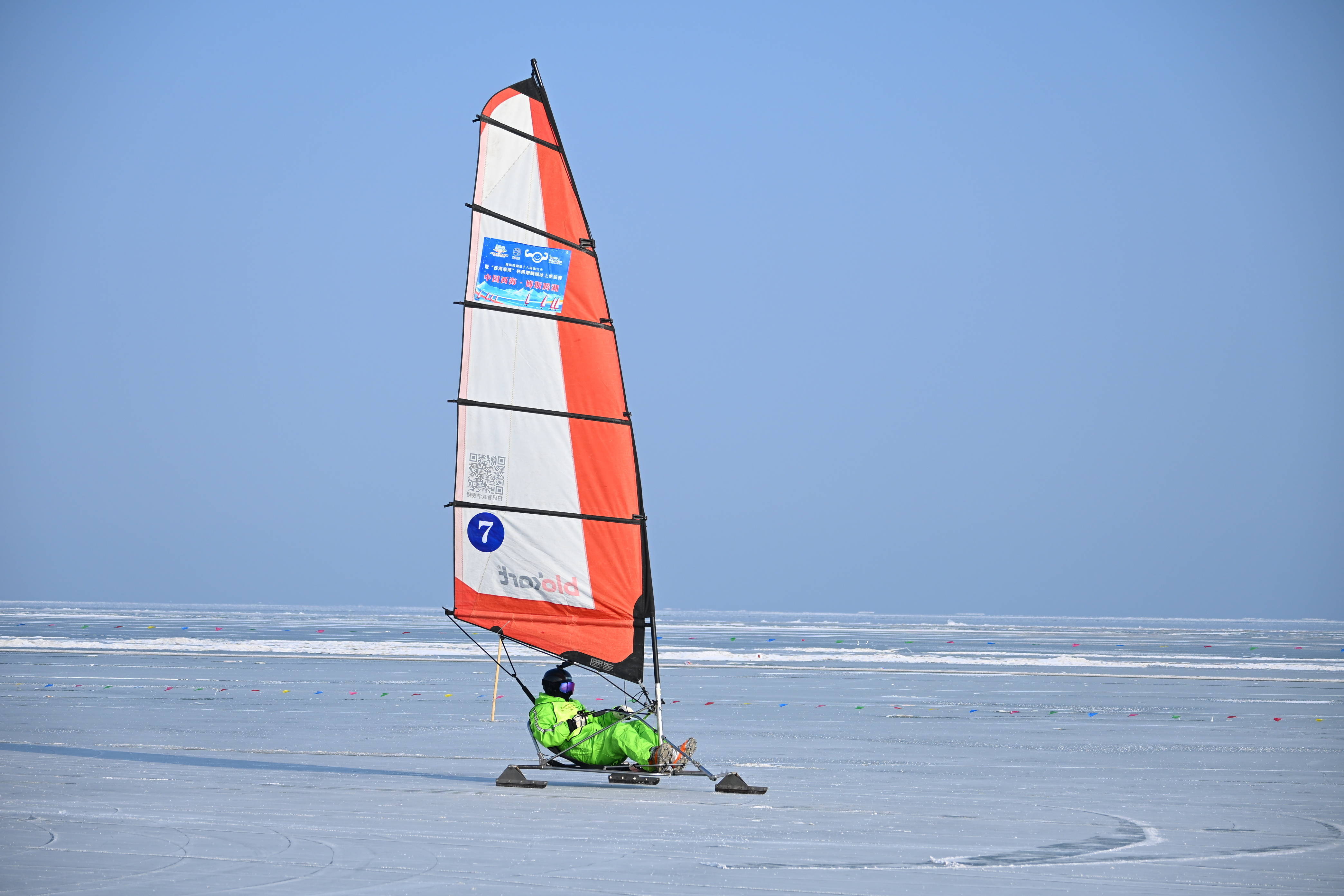 博斯腾湖冰原,参赛选手进行冰帆比赛。新华社发(孙浩天摄)博斯腾湖冰面上 冰上帆船赛竞逐