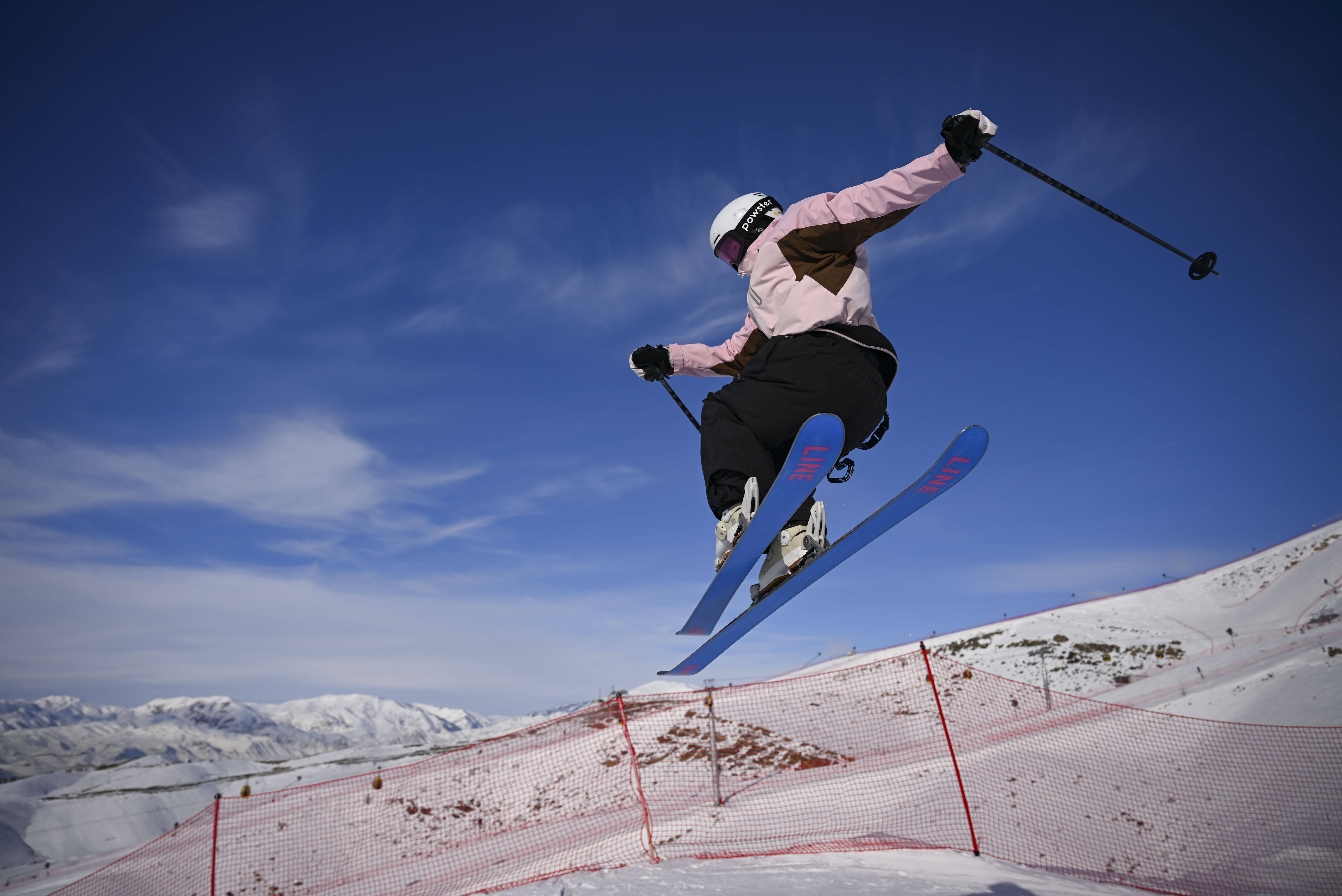 雪友在新疆阿勒泰将军山滑雪公园飞越跳台。新华社记者 胡虎虎 摄将军山国际滑雪度假区的热气球升空