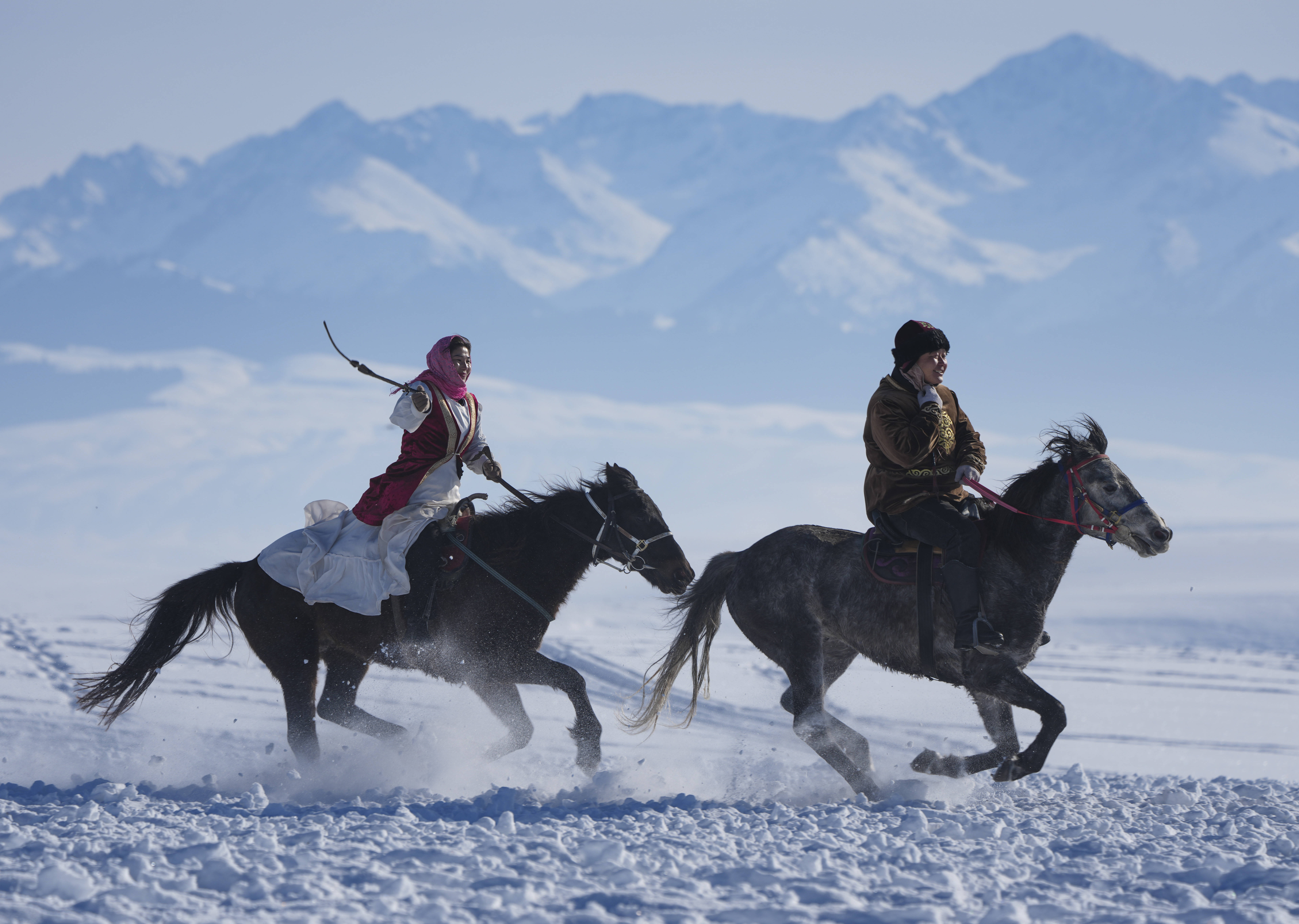 牧民在新疆昭苏县湿地公园为游客展示非遗“姑娘追”。新华社记者 胡虎虎 摄冰雪雕琢的诗意山河