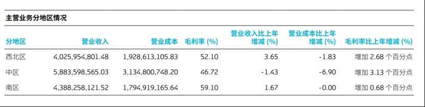毛利率方面,三大区域同样差异显著,南区毛利率达59.10%,中区毛利率仅为46.72%,区域间盈利水平差距明显。