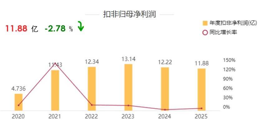 财报数据显示,2025年公司归属于上市公司股东的扣除非经常性损益的净利润为11.88亿元,同比下滑2.78%,这也是公司自2024年出现首次下滑后的再次下滑。