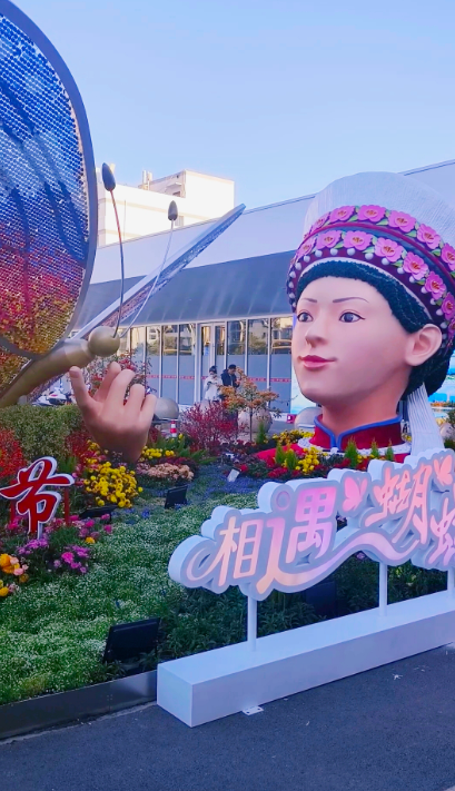 雕塑四周铺满鲜花,前方一只巨型蝴蝶展翅欲飞,金花雕塑的一只手伸向前方,与蝴蝶相映成趣。旅客纷纷赞叹“很有当地特色,春节氛围浓郁。”出站人群频频驻足打卡。有网友打趣称:“敢不敢叫她站起来!”
