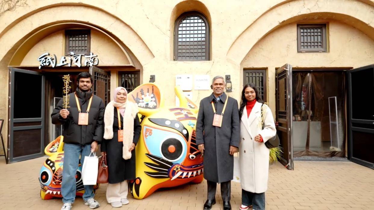 图为马尔代夫驻华大使法泽尔·纳吉布(右二)。于夯土墙和迷宫般的剧场群落间,马尔代夫驻华大使法泽尔·纳吉布通过沉浸式的戏剧表演感受中原文化的繁荣兴盛,并现场体验了木版年画等非遗项目。“河南对历史文化的保护与传承令人印象深刻,这些戏剧不仅视觉效果唯美,更传递出中国人民的价值观,我非常欣赏这种动人的呈现方式。河南不仅有厚重的历史文化,也有秀美的山水风光,我会邀请更多马尔代夫人来河南,探索和欣赏这片土地的文化之美。”法泽尔·纳吉布表示。红火的剪纸、香甜的糖画、喜庆的年画,处处洋溢着中国春节特有的热闹与温情。这些互动体验让驻华使节及家人在动手创作中感受中华传统技艺的魅力,也在欢声笑语间品味地道的新春年味。