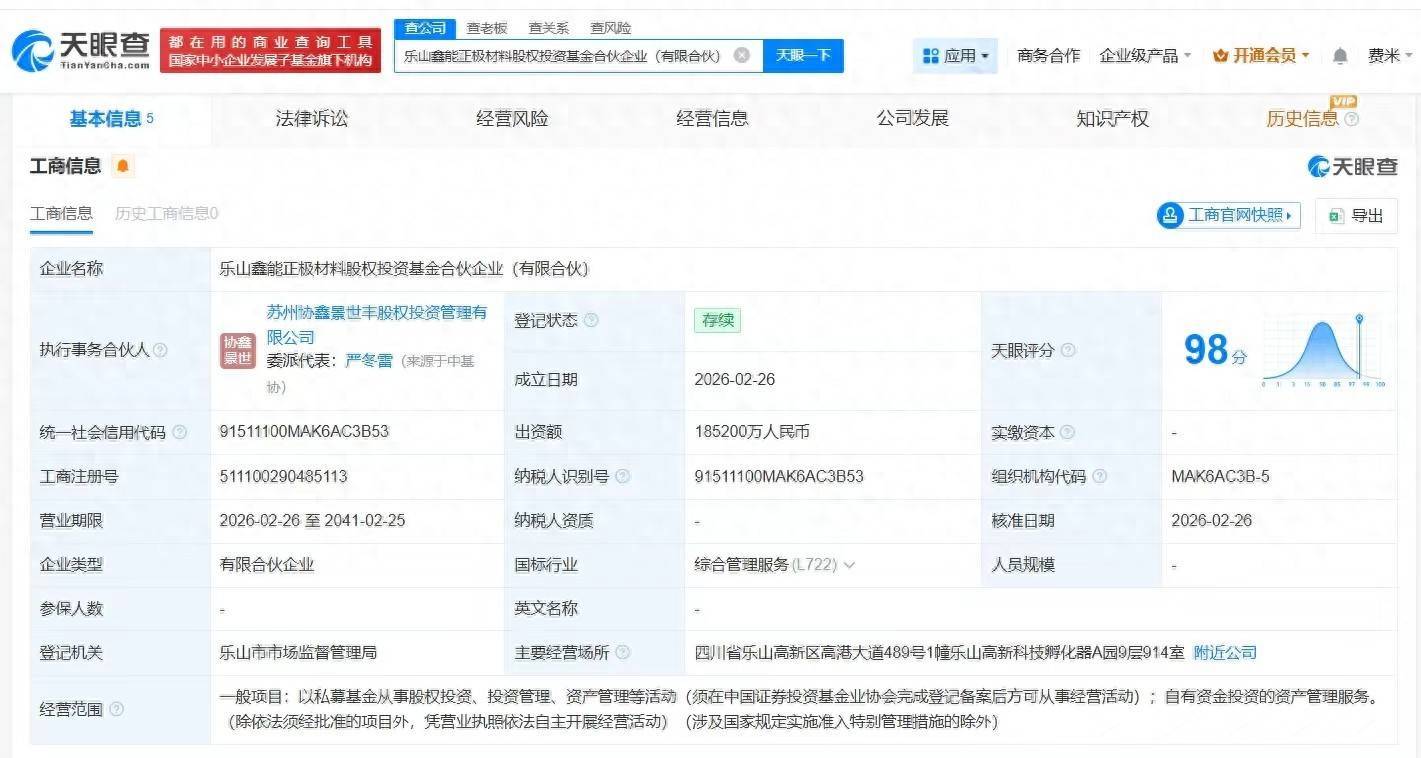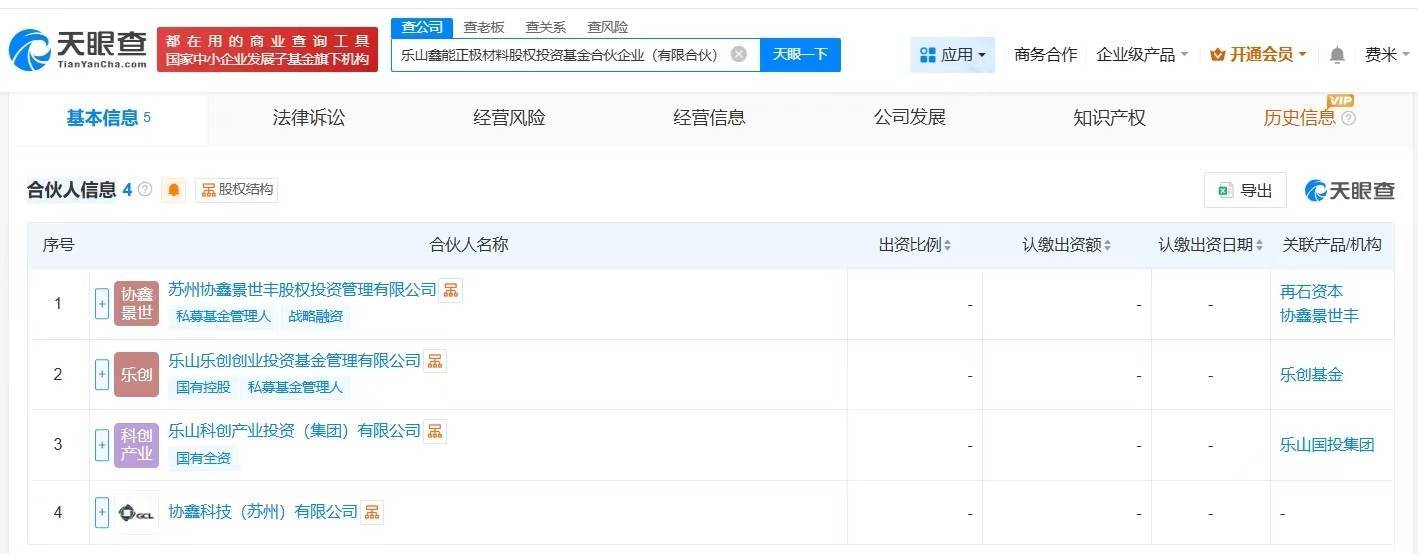 天眼查App显示,近日,乐山鑫能正极材料股权投资基金合伙企业(有限合伙)成立,执行事务合伙人为苏州协鑫景世丰股权投资管理有限公司,出资额18.52亿人民币,经营范围为以私募基金从事股权投资、投资管理、资产管理等活动,自有资金投资的资产管理服务,由苏州协鑫景世丰股权投资管理有限公司、乐山乐创创业投资基金管理有限公司、乐山科创产业投资(集团)有限公司、协鑫科技(苏州)有限公司共同出资。