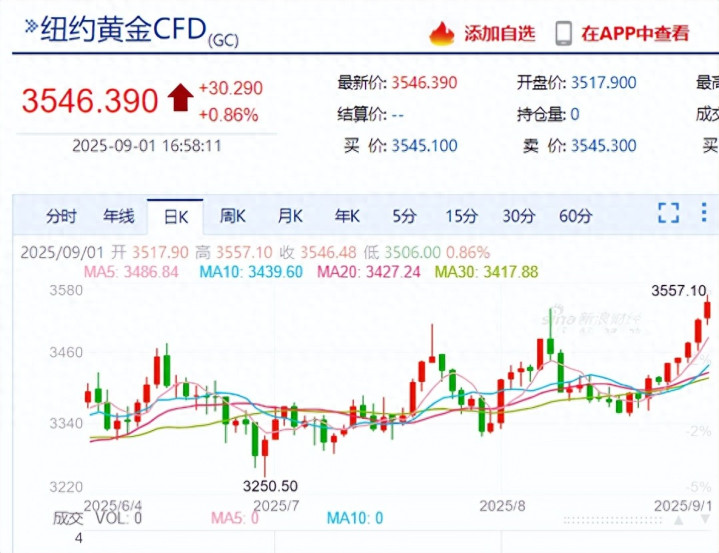 下图是纽约黄金价格的最新走势,最高见到了3557.1美元/盎司。
