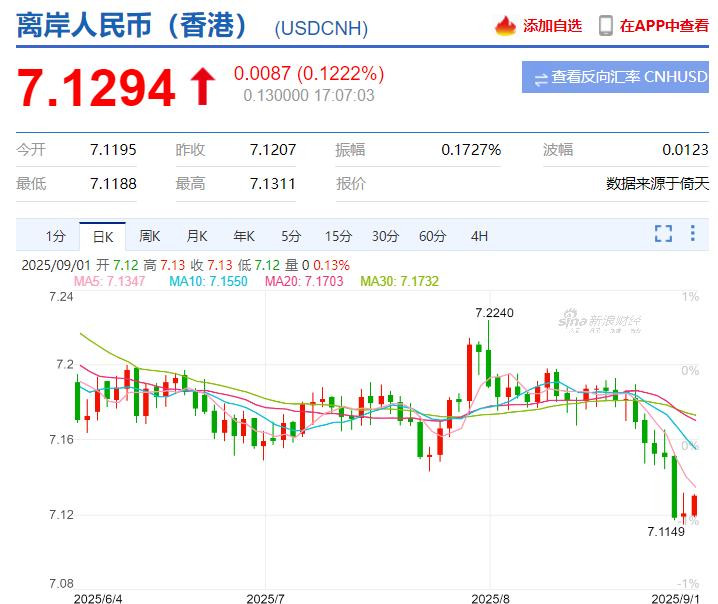 最近几个交易日,人民币对美元汇率出现了一波升值,目前离岸汇率在7.13附近,一度上攻到了7.11附近。
