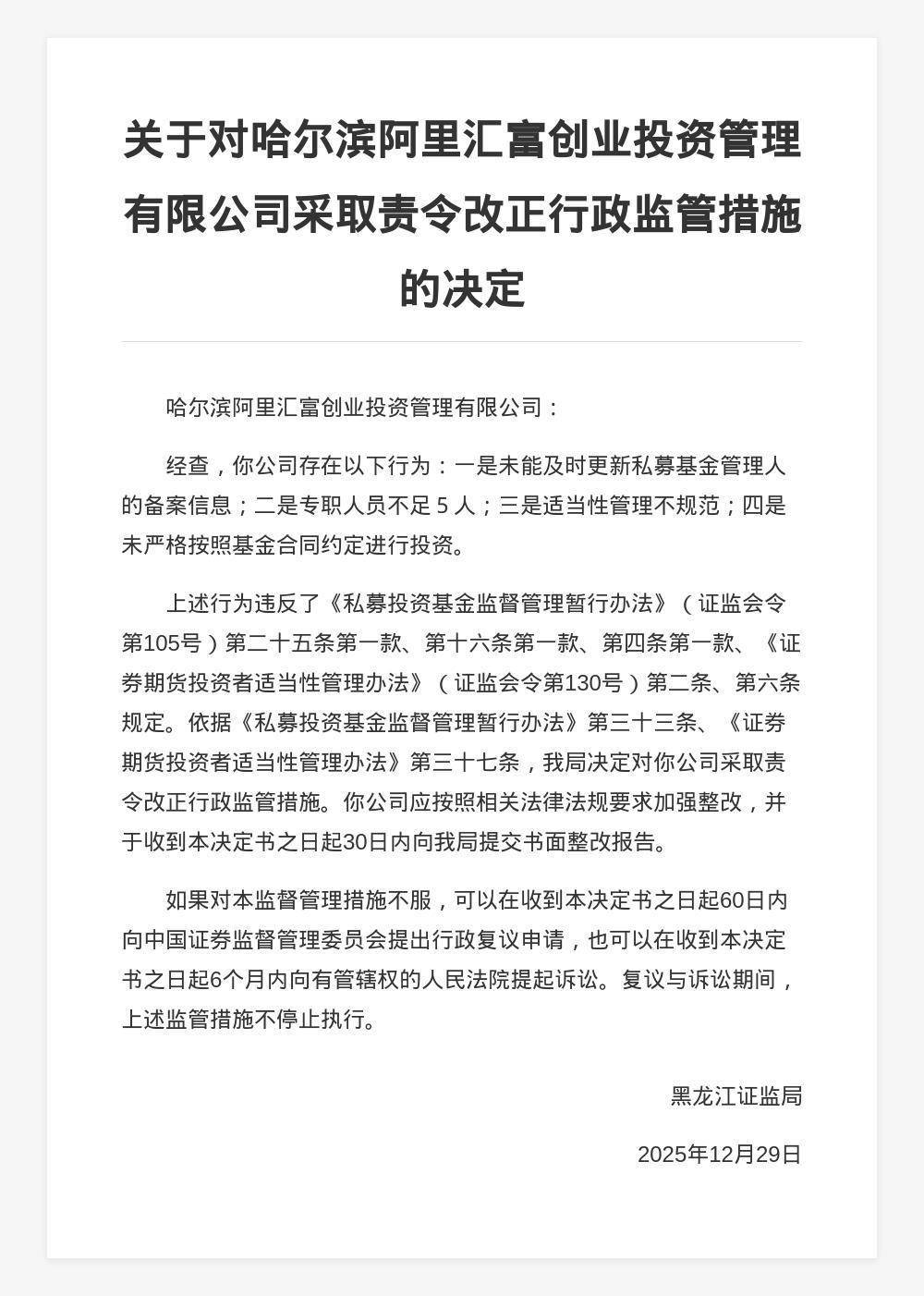 决定书显示,哈尔滨阿里汇富创业投资管理有限公司存在以下行为:一是未能及时更新私募基金管理人的备案信息;二是专职人员不足5人;三是适当性管理不规范;四是未严格按照基金合同约定进行投资。