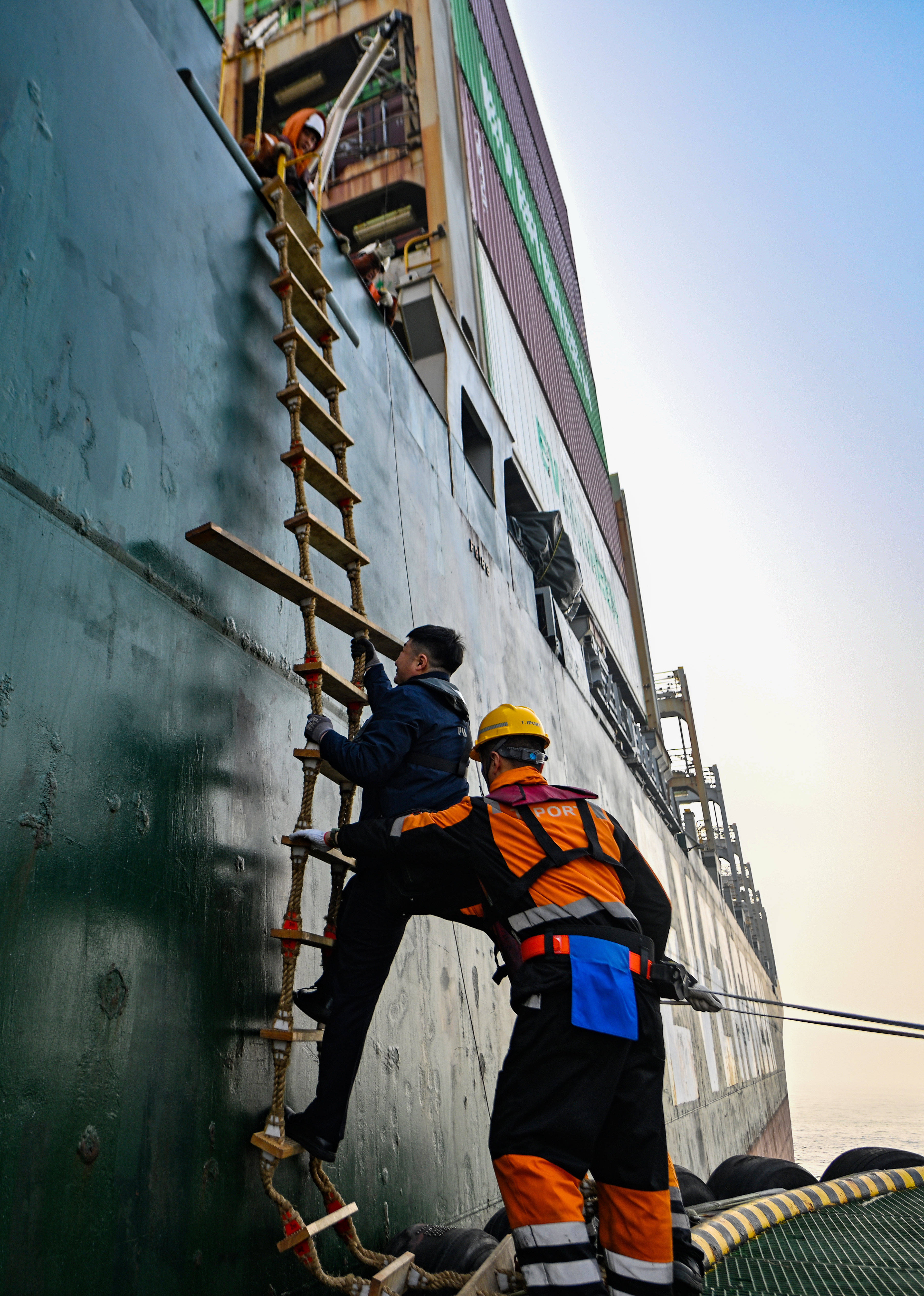 风浪虽不大,但连接码头和船舶的登船梯高达十余米,随着船体轻微晃动。“一定要看清脚下,用两只手抓紧两侧扶手。”孙勃边登梯边回头再三叮嘱记者。