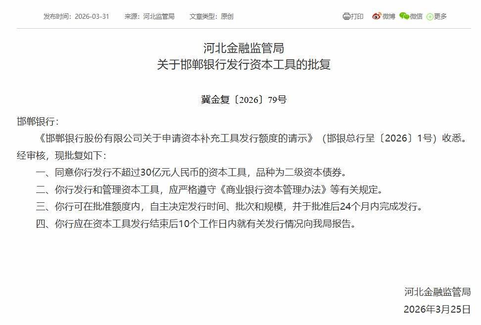 2026年3月31日,国家金融监督管理总局河北监管局发布批复公告,正式同意邯郸银行发行不超过30亿元人民币的二级资本债券,批复文号为冀金复〔2026〕79号。